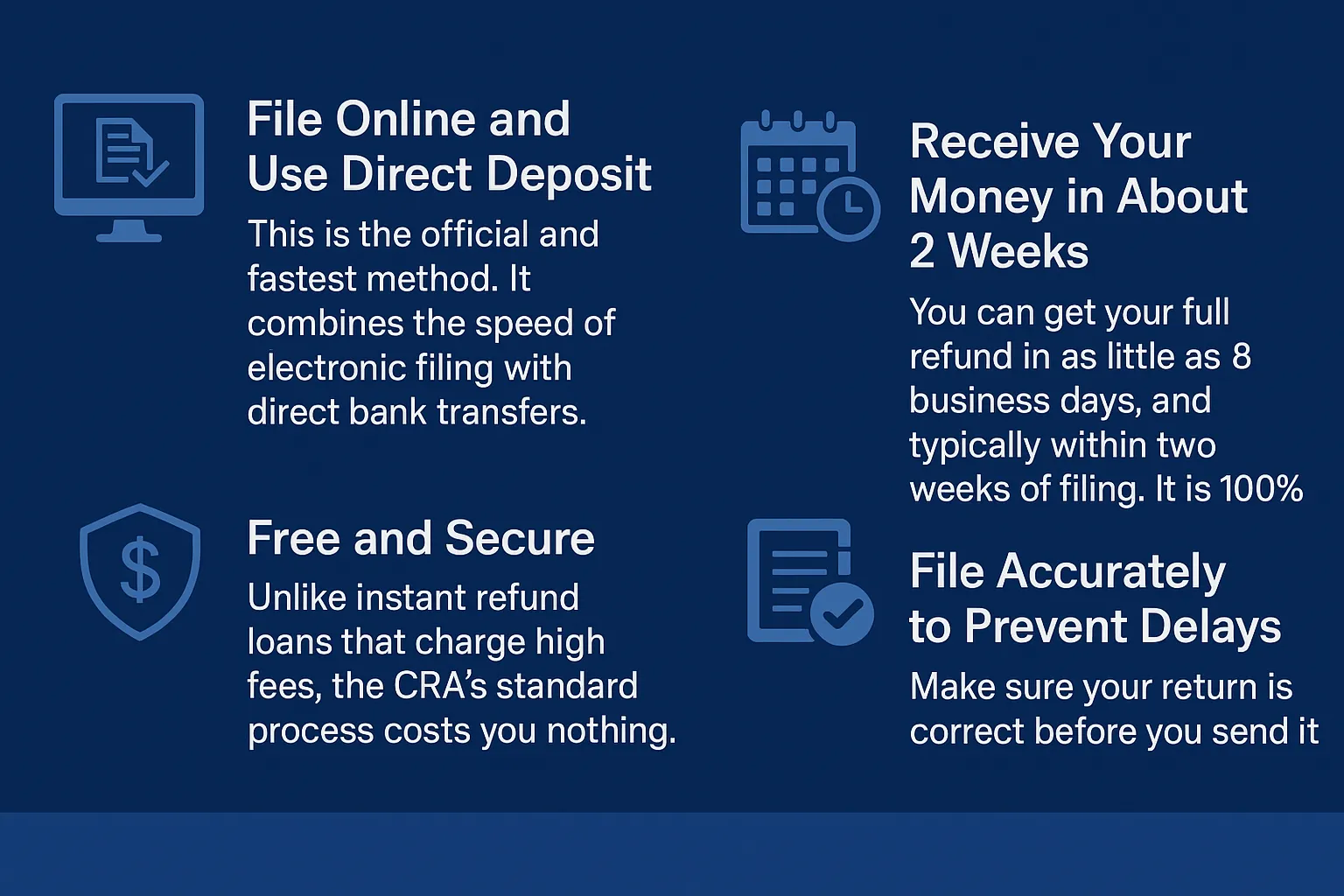 Waiting about two weeks for the full refund from the CRA’s free and fast online service is a much better financial decision. By planning ahead, you can avoid high fees and keep every dollar that you are owed.