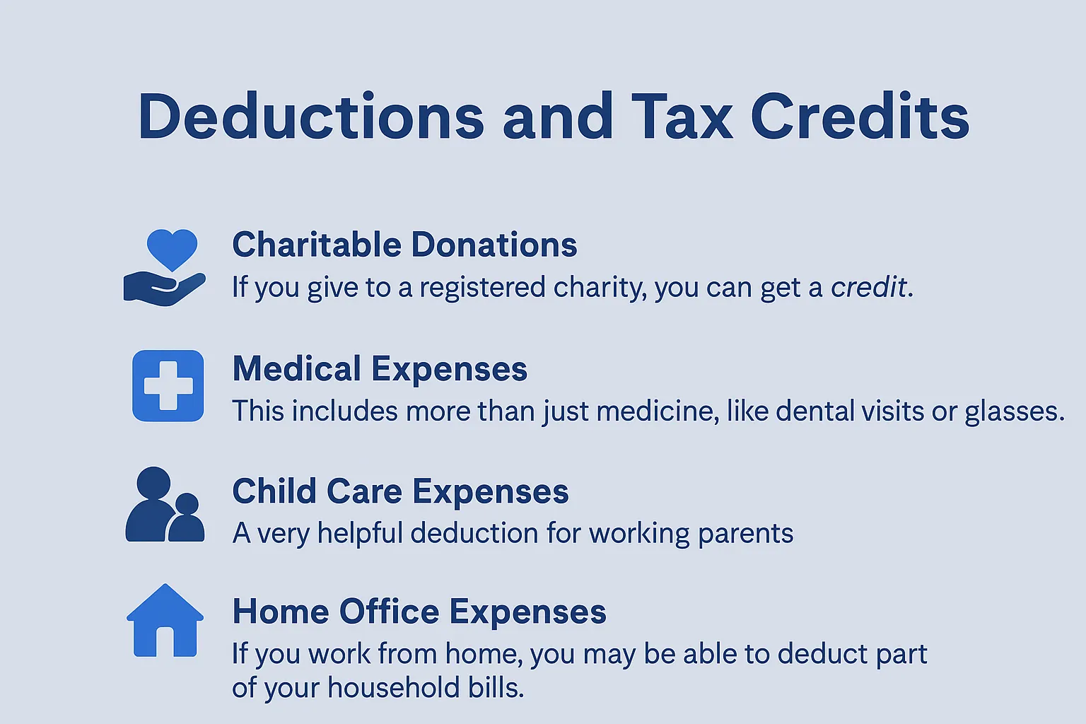 Next, let’s talk about deductions and credits. A tax deduction lowers your total income, while a tax credit directly reduces the amount of tax you have to pay. Many Canadians miss out on these because they don’t know what they can claim.